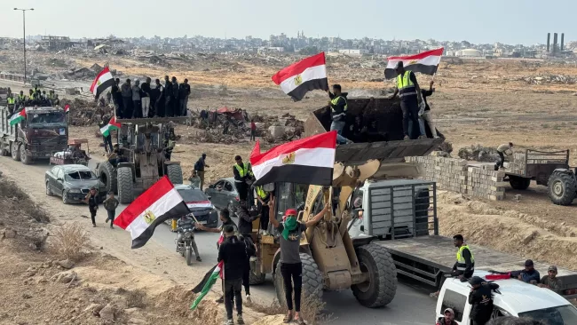 “I am standing now on the soil of the liberated Netzarim,” said Mohamed Mansour, spokesperson for the Egyptian committee, in remarks to Al Manassa. “This area was destroyed by the Israeli army. Its residents were expelled, civilians were executed here, and it has been rendered uninhabitable.”