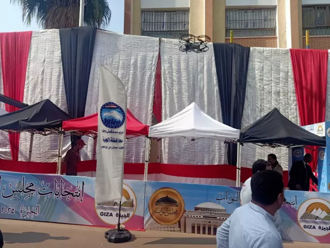 A drone at the polling station at Martyr Hesham Sheta girls' elementary school, Talbiya, Giza, Nov. 10, 2025