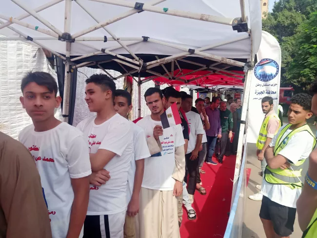 Voters' queues alongside Nation's Future Party banners at the House of Representatives elections in a Giza school, Nov. 10, 2025