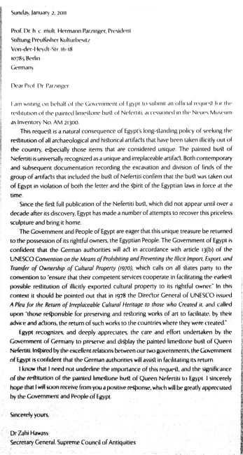 “The letter is not signed by the Prime Minister. There has been no official request for return from the Egyptian state,” the foundation said in a 2011 press release. The German Foreign Ministry echoed this, stating they had received no such request through official diplomatic channels.