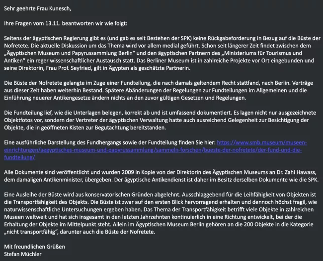 The foundation also claims to have never received an official restitution request from the Egyptian government, and neither has the German foreign ministry, their email responses argued.