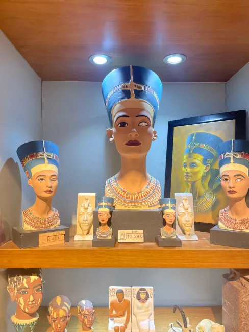 In Egypt, Nefertiti is omnipresent. Her face is painted as street art, her likeness sold in miniature form in Cairo tourist shops, and displayed on tote bags and T-shirts in indie boutiques. Her replicas even proudly stand in the gift shop of the Egyptian Museum in Tahrir Square.