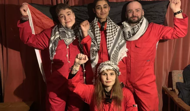 أربعة نشطاء في حركة فلسطين أكشن يرفعون العلم الفلسطيني، 15 مارس 2025