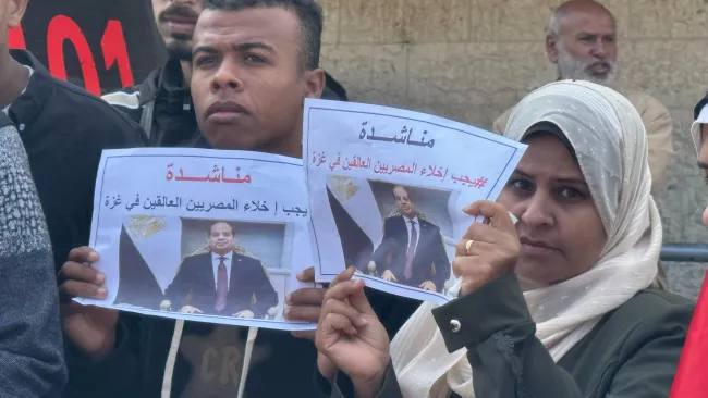 وقفة للمصريين العالقين في قطاع غزة لمطالبة السيسي بإجلائهم، 10 أبريل 2025وما زال الوسطاء في مصر وقطر وأمريكا غير قادرين على إحراز تقدم في استكمال تنفيذ اتفاق وقف إطلاق النار في قطاع غزة، بعد إتمام المرحلة الأولى منه بإطلاق حماس سراح 33 محتجزًا بينهم 8 قتلى، فيما أفرجت إسرائيل عن 1800 معتقل فلسطيني في سجونها.