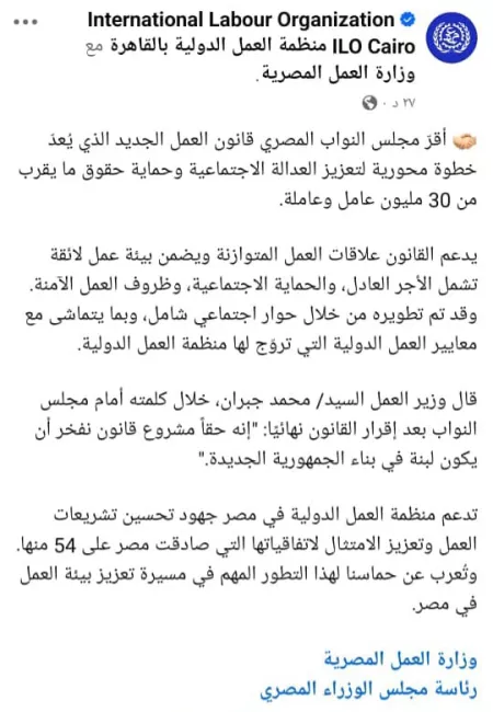 حذفت الصفحة الرسمية لمنظمة العمل الدولية بالقاهرة على فيسبوك بيانًا أصدرته الأربعاء الماضي، بعد يومين من نشره، أشادت فيه بإقرار البرلمان المصري قانون العمل الجديد، معتبرة إياه "خطوة محورية لتعزيز العدالة الاجتماعية وحماية حقوق ما يقرب من 30 مليون عامل وعاملة"، وجاء حذف البيان عقب انتقادات من مؤسسات حقوقية ونقابية للمنظمة الدولية واتهامها بالانحياز للحكومة المصرية.(*)