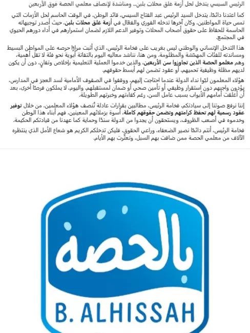 ودشن بعضهم على فيسبوك لوجو يشبه شعار "بـ لبن"، كُتب عليه "بالحصة"، مطالبين بتنفيذ الوعود السابقة من مجلس الوزراء ووزارة التربية والتعليم بشأن عقد مسابقة مخصصة لمن عملوا بالحصة على مدار السنوات الماضية، مؤكدين أن تجاهلهم المستمر يهدد مستقبلهم الوظيفي.