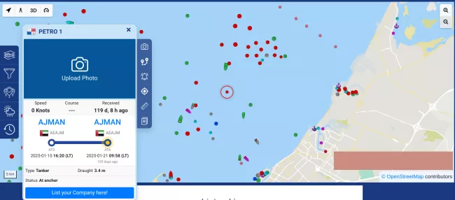تعطل سفينة بها طاقم مصري منذ 105 أيام بالقرب من ميناء عجمان دون السماح لها بالرسووتُظهر بيانات الرحلة أن ناقلة النفط، أبحرت من ميناء عجمان في 15 يناير 2025 الساعة 16:20 بالتوقيت المحلي، وعدلت وجهتها إلى نفس الميناء في 21 يناير 2025 الساعة 09:58 صباحًا، وما زالت متوقفة منذ أكثر من 105 أيام، ما يعني أنها قامت برحلة دائرية خلال 5 أيام فقط، قطعت خلالها 25.67 ميل بحري، بسرعة متوسطة بلغت 3.9 عقدة وسرعة قصوى وصلت إلى 5.3 عقدة.