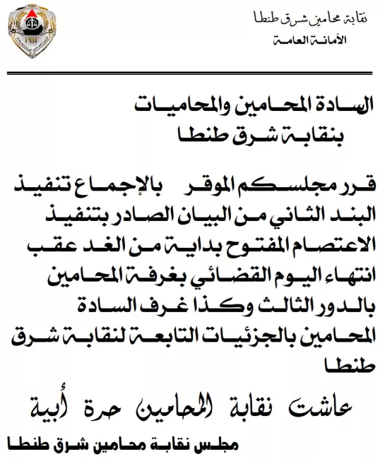 قرار مجلس نقابة محامي شرق طنطا بالاعتصام المفتوحوقال أمين عام نقابة محامين شرق طنطا وائل عبد الستار لـ المنصة إن قرار محاميي شرق طنطا لا يعني شق صف المحامين، مشددًا على "وحدة الصف في مواجهة هذه الرسوم غير القانونية".