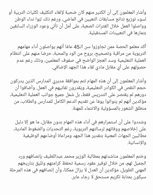 وأشار البيان إلى أن الكثير منهم كان ضحيةً لإلغاء التكليف لكليات التربية أو لسوء توزيع نتائج مسابقات التعيين في الماضي، ورغم ذلك "لبّوا نداء الوطن وواصلوا العمل خلال الفترات الصعبة، على أمل أن تأتي وعود الوزراء السابقين بثمارها في التعيينات المستقبلية".