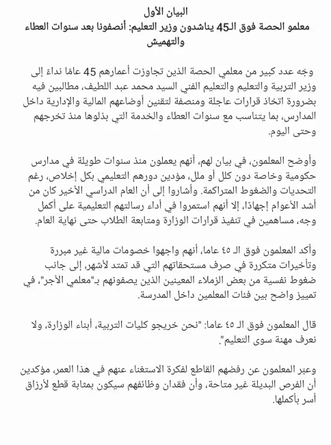 ووجّه المعلمون نداءً إلى وزير التعليم محمد عبد اللطيف، لمطالبته "بإنصافهم وردّ الجميل لهم، من خلال توفير عقود رسمية تحفظ كرامتهم وتليق بتاريخهم المهني الطويل"، مؤكدين أن "العدل لا يزال ممكنًا"، وأن "إنصافهم في هذه المرحلة سيكون بمثابة تكريم مستحق لا رجاء عابر"، حسب البيان.