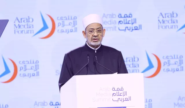 شيخ الأزهر أحمد الطيب متحدثًا أمام قمة الإعلام العربي في دبي، 17 مايو 2025