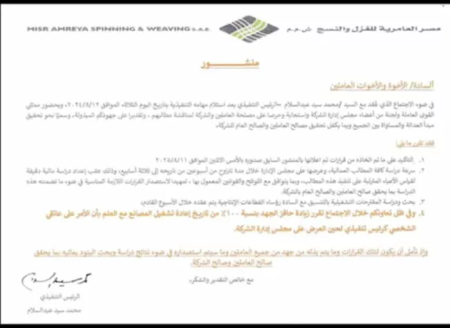 وقال عامل ثانٍ إن عبد السلام أخبرهم خلال الاجتماع أن مسؤول مديرية العمل لفت انتباهه إلى أخطاء في احتساب الأجر الشهري، من بينها احتساب الإضافي على الأجر الأساسي فيما يجب احتسابه على الشامل، وأن كل ملاحظات مسؤول مديرية العمل سيتم تعديلها في راتب الشهر المقبل، لكنه لا يستطيع تنفيذ الزيادة التي يطالبون بها الآن، لكن "يمكن زيادة حافز الجهد بنسبة 100% ليصبح 300 جنيه بدلًا من 150 جنيه، إضافة إلى تنفيذ القرار الصادر بتاريخ 11 أغسطس/آب، بزيادة بدل الوردية من 400 إلى 600 جنيه، وتوفير سيارة إسعاف مجهزة"، وأصدر منشورًا عقب الاجتماع بذلك، كما وعد بتسديد الديون المتأخرة على الشركة لهيئة التأمينات الاجتماعية.