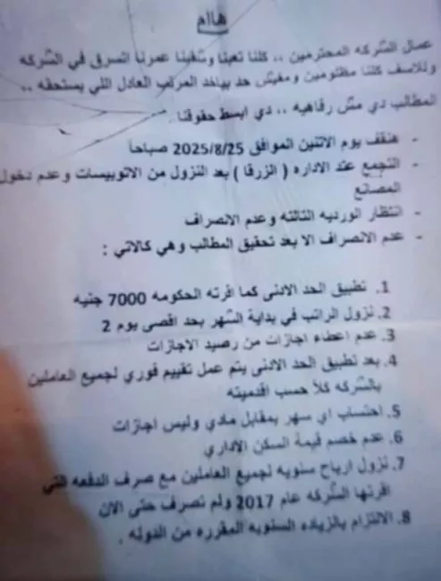 ووزع مجموعة من العمال بيانًا مطلع الأسبوع الحالي، حصلت المنصة على صورة منه، يدعو زملاءهم للإضراب عن العمل وعدم دخول المصانع والاعتصام أمام مقر الإدارة حتى تحقيق مطالبهم.
