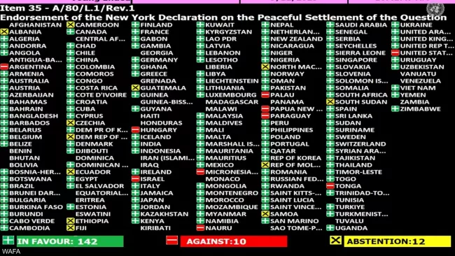 صادقت الجمعية العامة للأمم المتحدة، أمس الجمعة، وبأغلبية 142 صوتًا من 164، على "إعلان نيويورك"، الذي يرسم خطوات محددة زمنيًا نحو تطبيق حل الدولتين بين إسرائيل والفلسطينيين، في خطوة وصفت بأنها الأكثر جدية منذ سنوات لدفع مسار التسوية السياسية.