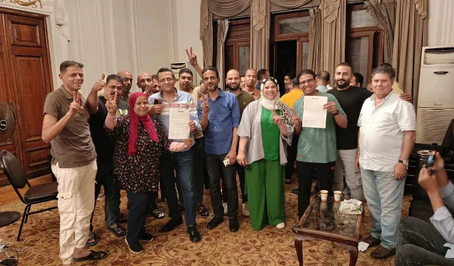 صحفيو الوفد مع نقيب الصحفيين خالد البلشي عقب عقد اتفاق مع رئاسة الحزب على تطبيق الحد الأدنى للأجور، 4 أكتوبر 2025