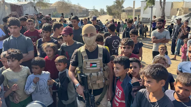 جانب من تسليم كتائب القسام 13 محتجزًا إسرائيليًا أحياء للصليب الأحمر في جنوب قطاع غزة، 13 أكتوبر 2025