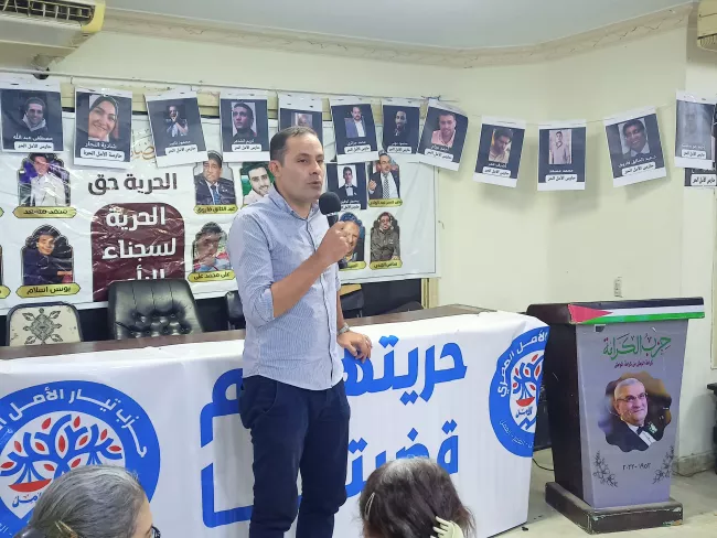 المعارض السياسي أحمد الطنطاوي متحدثًا خلال مؤتمر أسر المعتقلين المنعقد بحزب الكرامة، 25 أكتوبر 2025من ناحيته، دعا رئيس حزب الكرامة سيد الطوخي خلال كلمته بالمؤتمر إلى دور أكثر فاعلية من نقابة الصحفيين في الدفاع عن أعضائها والمطالبة بالإفراج عن أشرف عمر، مشددًا على أن "الصمت يصنع مناخًا يسمح بتكرار الانتهاكات ضد الجميع".