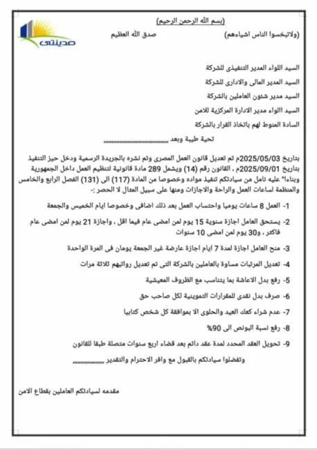 ودعت المذكرة الإدارة إلى الالتزام بـ قانون العمل رقم 14 لسنة 2025، وتنفيذ نصوص مواده وخصوصًا من المادة 117 إلى 131 الفصل الرابع والخامس والمنظمة لساعات العمل والراحة والإجازات.