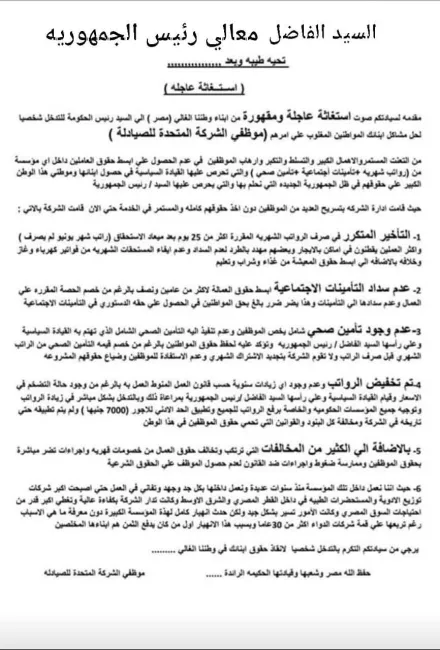 استغاثة عمال المتحدة للصيادلة إلى رئيس الجمهورية، نوفمبر 2025وأشار العامل الذي طلب أيضًا عدم ذكر اسمه، إلى أنهم تقدموا بشكاوى عدة مرات لمكاتب العمل التابعين لها، وديوان وزارة العمل، بخصوص عدم تطبيق الشركة للحد الأدنى للأجور، ولكن لم يتم الرد على شكواهم، مشيرًا إلى أن العمال المعتصمين تقدموا بشكاوى إلى رئيس الجمهورية ورئيس مجلس الوزراء؛ للمطالبة بإغاثتهم من الظلم الواقع عليهم.