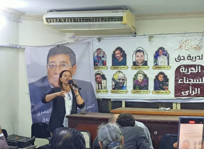 نجلاء سلامة زوجة الباحث والخبير الاقتصادي عبد الخالق فاروق متحدثة خلال تدشين لجنة الدفاع عن سجاء الرأي بحزب الكرامة، 10 نوفمبر 2025وأشار إلى أنه "في أكثر الفترات السياسية صرامة لم يكن أصحاب الرأي يُعتقلون بسبب آرائهم، حتى في عهد الرئيس جمال عبد الناصر، ورغم الانتقادات التي وُجهت لنظامه بتوسيع الاعتقالات، لم يكن أصحاب الرأي يُعتقلون بسبب آرائهم".