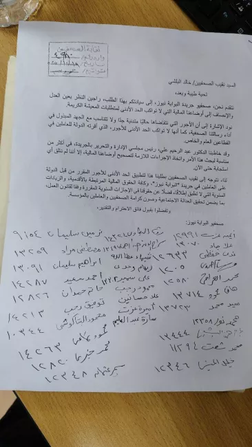 وسبق أن تقدموا بمذكرة رسمية بتاريخ 4 نوفمبر/تشرين الثاني الجاري لإدارة التحرير، وطالبوا فيها بجلسة مفاوضات عاجلة، حيث رد عبر مديرة مكتبه بأنه "ليس لديه حلول"، ضاربًا عرض الحائط بمساعي النقابة، وفق البيان.