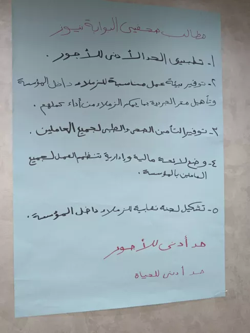 وفي المقابل، اكتفى المتضامنون بالجلوس على سلالم المبنى رافعين لافتات ورقية ومُعلقين أخرى سجلوا عليها أسماءهم، مؤكدين تضامنهم الكامل مع زملائهم المطالبين بتطبيق الحد الأدنى للأجور.