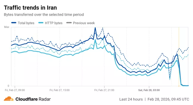 أظهرت منصة Cloudflare Radar، صباح اليوم السبت، اضطرابًا حادًا في حركة الإنترنت الصادرة من إيران خلال آخر 24 ساعة، وسجَّلت تراجعًا كبيرًا ومفاجئًا في حجم البيانات المنقولة، وذلك بالتزامن مع الهجوم الأمريكي الإسرائيلي الذي شملت أهدافه الأولية مكتب المرشد الأعلى للثورة الإسلامية ومواقع عسكرية وحكومية.