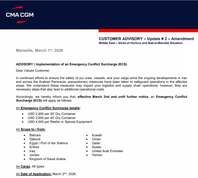 شركة الشحن الفرنسية CMA CGM تخطر شركات الاستيراد والتصدير بتطبيق الرسوم الجديدة اعتبارًا من اليوم، 1 مارس 2026ووفقًا للمنشور، تم تحديد رسوم إضافية بقيمة 2000 دولار للحاوية 20 قدمًا، و3000 دولار للحاوية 40 قدمًا، فيما تصل الرسوم إلى 4000 دولار أمريكي للحاويات المبردة والمعدات الخاصة.