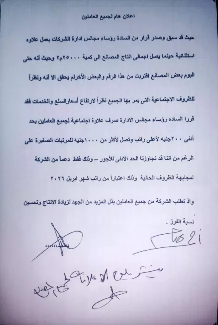 قرار العلاوة السنوية لعمال سيراميكا إينوفاوأضاف العامل "القرار اللي صدر عن مجلس الإدارة امبارح بيقول إن بعض مصانع الشركة محققتش المستهدف 25 ألف متر سيراميك يوميًا، ونظرًا للظروف الاجتماعية وارتفاع السلع والخدمات فالزيادة 200 جنيه للمرتبات المرتفعة تصل لـ1000 جنيه للمرتبات الصغيرة، هو كده مراعيين ارتفاع الأسعار؟ أمال لو مش مراعيين كانوا ادولنا كام؟ ثم إحنا عندنا أصلًا مرتبات مرتفعة؟ ده أنا بقالي 25 سنة في الشركة مرتبي 5700 جنيه".