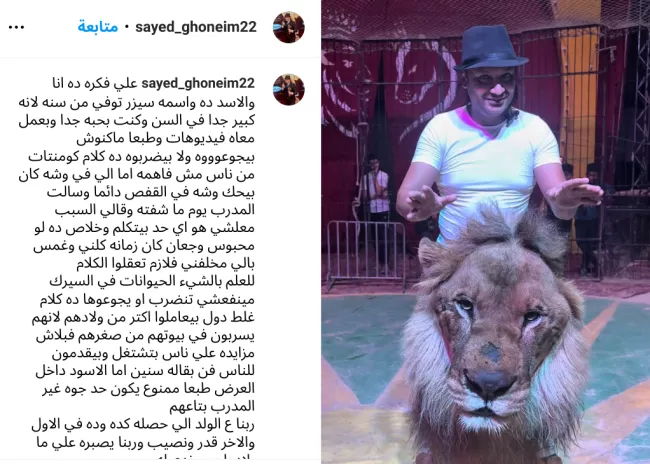 ويبدو أن الخطوط غير واضحة بين السلوكيات العادية، والمؤذية أو المسيئة لحيوانات السيرك، للدرجة التي تسمح لأحد مشاهير السوشيال ميديا يدعى سيد غنيم أو المذيع الفرفوش بأن يظهر في فيديو ممتطيًا ظهر أسد بسيرك محمد الحلو في الساحل الشمالي.