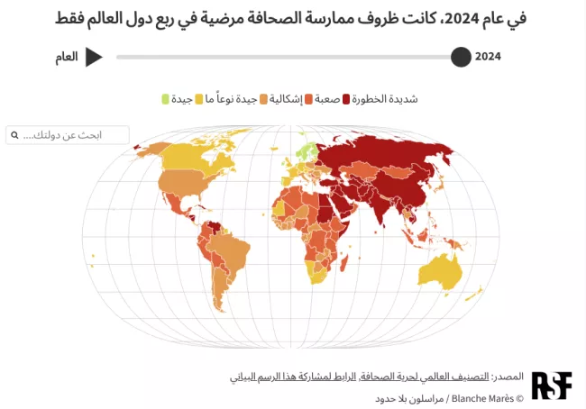 وتظهر البيانات أن تدهور موقع مصر مستمر، فقد انتقلت من فئة الدول "الصعبة" إلى فئة "الأشد خطورة على الصحفيين" منذ عام 2017.