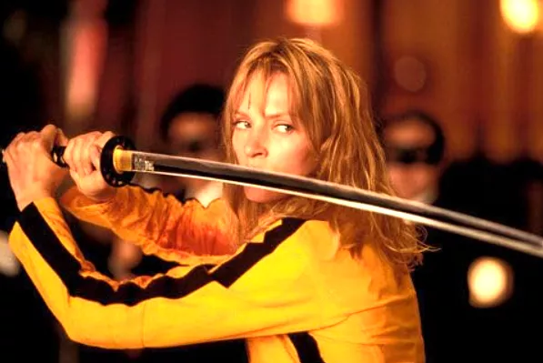 أوما ثورمان في مشهد قتالي من فيلم Kill Bill: Vol. 1، (2003)، إخراج كوينتن تارانتينو