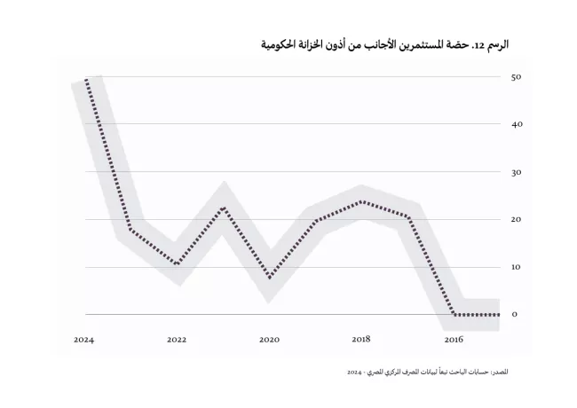 أما عن نصيب الأجانب، فقد كان شديد التذبذب بفضل قدرتهم الأكبر على الاختيار بين الأسواق العالمية، لكن خلال طفرات ارتفاع أسعار العائد على الدين العام وانخفاض قيمة العملة المحلية (وهي إجراءات مدفوعة بالأساس بمطالبات الصندوق) كان لديهم حضور قوي، مثل حضورهم الطاغي في الوقت الراهن من خلال استحواذهم على نصف سوق أذون الخزانة تقريبًا، وهي نسبة شديدة الارتفاع بالمقارنة مع الأسواق الناشئة.