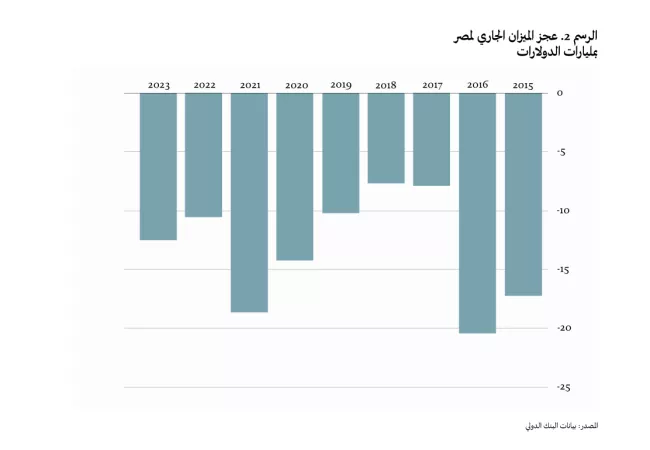 استطاع النمو الاقتصادي استعادة شيء من زخمه منذ عام 2014، وتجاوز معدل نمو السكان، لكن في المقابل ظل عجز الميزان الجاري مرتفعًا وأخذ يتفاقم تدريجيًا. نبع هذا العجز من أزمات دولية خلال هذا العقد أثّرت سلبًا على إيرادات النقد الأجنبي، من تباطؤ الاقتصاد العالمي خلال وباء كوفيد إلى التضخّم العالمي بعد حرب روسيا وأوكرانيا، وأخيرًا تأثير الحرب على غزة على إيرادات قناة السويس. لكن تزايدت ضغوط النقد الأجنبي أيضًا من عوامل محلية تتعلّق بارتفاع خدمة الدين الخارجي، التي نبعت من صعود تكاليف الديون عالميًا وتوسّع الدولة في أعمال البنية الأساسية.
