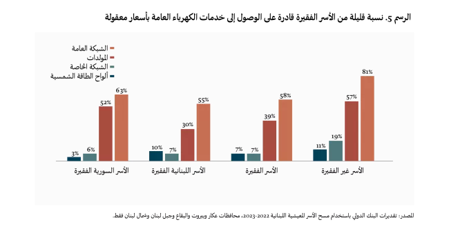بموازاة ذلك، أدّى رفع الدعم عن الوقود منذ أكتوبر/تشرين الأول 2022 بدوره إلى زيادة تكاليف الخدمات الأساسية، مثل النقل والتدفئة والكهرباء، علمًا بأن التيّار الكهربائي متوفر بشكل جزئي لجميع الفئات الاجتماعية والاقتصادية، وقد بلغ متوسط التخفيض سبع ساعات خدمة يوميًا. وباتت المولدات الخاصة، باهظة الثمن والمسبّبة للتلوّث، المصدر الرئيسي للكهرباء، ما فاقم بدوره العبء المالي على الأسر الفقيرة.