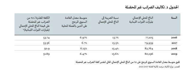 تشير دراسة أجرتها مؤسّسة Financially Wise إلى أن تكلفة القصور في تحصيل الضرائب باهظة، ووفقًا لهذه الدراسة، كان بإمكان لبنان توفير مليارات الدولارات من الفوائد على ديونه وتقليص اللامساواة عبر الأجيال لو زادت حصة الضرائب في الناتج المحلي الإجمالي ولو بنقطة واحدة.