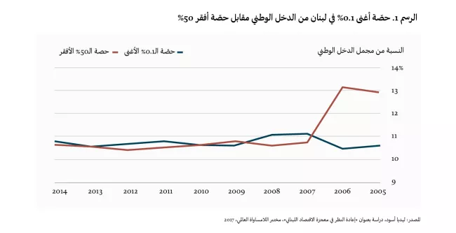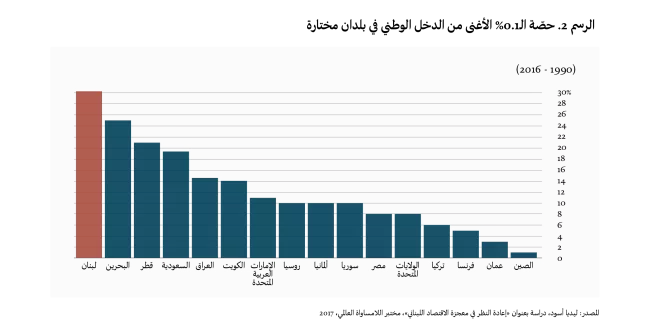 بالجمع بين نتائج المسوحات التي شملت الأسر، والحسابات الوطنية، وتصنيفات أصحاب المليارات التي نشرتها مجلتا فوربس وأريبيان بيزنس، وسجّلات ضريبة الدخل الشخصي التي تمكّنت من الوصول إليها، استنتجت الباحثة أن الدخل مركّز للغاية، إذ حصل أغنى 1% و10% من السكّان البالغين على نحو 25% و55% من الدخل الوطني في المتوسّط على التوالي، ما يضع لبنان بين أكثر الدول التي تسجل أعلى مستويات اللامساواة في الدخل بالعالم، إلى جانب البرازيل وروسيا وجنوب إفريقيا والولايات المتّحدة.