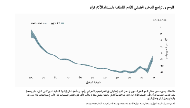 وارتفع معامل جيني لدخل الأسرة اللبنانية من 0.42 في 2011-2012 إلى 0.61 في 2022-2023، ما يضع لبنان بين البلدان الأكثر لا مساواة في الدخل في العالم، وباتت أغنى 10% من الأسر تمتلك 54% من إجمالي الدخل في البلاد، مقارنة بنحو 49% قبل عشر سنوات.