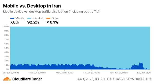 تؤكد أيضًا بيانات Cloudflare Radar هذه التحولات من زاوية أخرى، من خلال تتبع حجم البيانات المتبادلة عبر الإنترنت داخل إيران. مع الهجوم العسكري، انخفض حجم البيانات بشكل حاد. واستمر التراجع حتى يوم 16، ثم دخلت الشبكة مرحلة اضطراب شديد في 17 و18، وشهد 17 يونيو انقطاعات متقطّعة (ثلاثة شرائط برتقالية)، أمّا الانقطاع شبه الكامل فبدأ مساء 18 يونيو، قبل أن تنهار فعليًا في 19 يونيو، في ما يُعرف بالانقطاع شبه الكامل (Near-total Blackout).