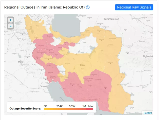 تعرض هذه الخريطة الصادرة عن مزوّد بيانات الإنترنت IODA توزيع انقطاعات الإنترنت داخل إيران خلال الفترة المعنية. وتعتمد على مقياس شدة الانقطاع/Outage Severity Score الذي يقيس حجم الشبكات المتأثرة ونسبة الانخفاض في إشارات IODA، فيُقِّدر العدد التقريبي لعناوين الشبكات المتضررة، لا عدد المستخدمين الأفراد، مما يوفّر لمحة بصرية فورية عن التفاوت الجغرافي في تعرّض المحافظات الإيرانية للانهيار الرقمي.