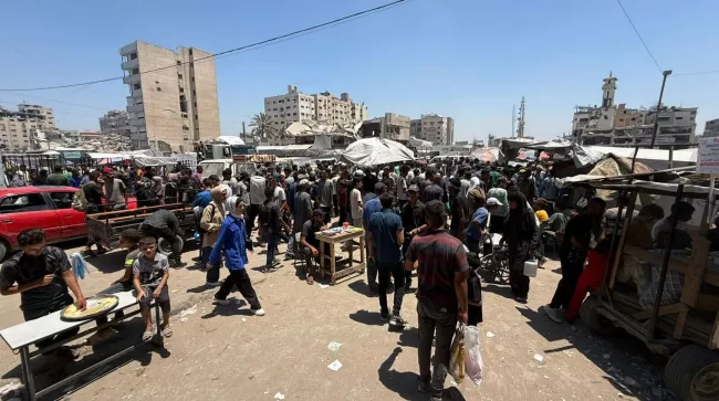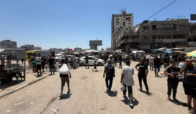 حالة من الفوضى بإنتشار الباعة والمتجولون يشهدها مفترق السرايا وسط مدينة غزة نتيجة غياب شرطة المرور التابعة لحركة حماس، الأحد 20 يوليو 2025