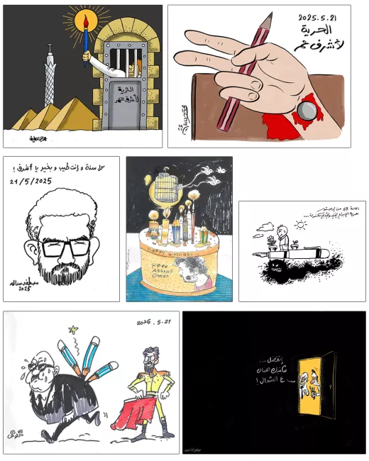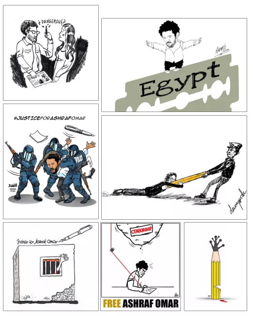 مرَّت سنةٌ كاملةٌ على القبض على زميلنا رسّام الكاريكاتير بـ المنصة أشرف عمر. في مثل هذا اليوم من العام الماضي اختفى أشرف بعد اقتحام بيته وتعذيبه انتزاعه من عمله وأسرته وحياته. وبعد إخفائه قسرًا ظهرَ في نيابة أمن الدولة العليا ليواجه التهم المعلّبة المعروفة؛ الانضمام لجماعة إرهابية.. إلخ، إلخ.