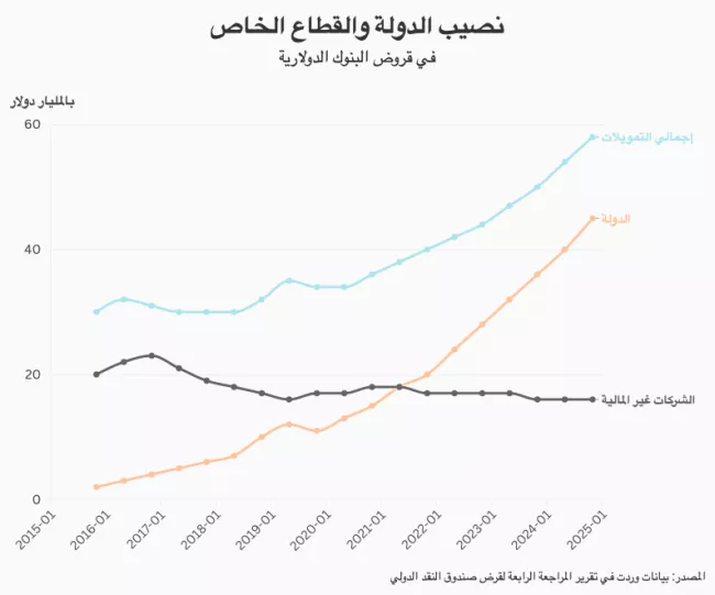 تُظهر بياناتُ صندوق النقد الدولي تسارع معدل الاقتراض الحكومي بالدولار الأمريكي من البنوك المحلية لتصل إلى أعلى معدلاتها خلال تسع سنوات بنهاية نوفمبر/تشرين الثاني الماضي، مقارنةً بتراجع اقتراض القطاع الخاص، ما يعكس مزاحمة قوية من القطاع الحكومي.