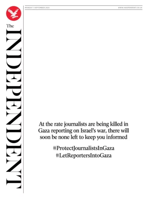 الصفحة الأولى من صحيفة الإندبندنت البريطانية تدعو لحماية الصحفيين في غزة، 1 سبتمبر 2025.