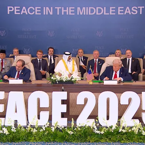 السيسي: اسمحوا لي في البداية إن أنا أرحب بفخامة الرئيس، وأنا سعيد و.. وكلي شرف لوجودك في مصر، في شرم الشيخ مدينة السلام، واسمح لي فخامة الرئيس إن أنا، باسمي وباسم كل المصريين اللي (كلمة غير واضحة) وكل محبي السلام، إني أوجه لك التحية والاحترام على تحقيق هذا الإنجاز الرائع والعظيم.