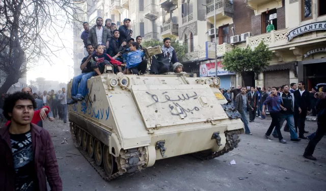 متظاهرون على إحدى المدرعات وأسفلها "يسقط مبارك". الصورة: حسام الحملاوي- فليكر، برخصة المشاع الإبداعي