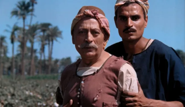عزت العلايلي ومحمود المليجي في أحد مشاهد فيلم الأرض ليوسف شاهين. 1969