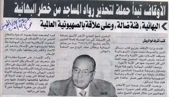 استصدر الأساتذة المعترضون على تعيين بهائية في منصب أكاديمي من الأزهر بيانًا بتكفير البهائيين. وفي يناير/كانون الثاني 1986 نشرت جريدة عقيدتي التابعة لمؤسسة أخبار اليوم بيان مجمع البحوث الإسلامية "المندد بالدعوة البهائية"، مُستدلًا بما واجهه أتباعها من "قتل وتنكيل" من المسلمين.