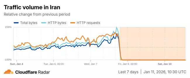 تشير قرائن القياس السابقة إلى أن ما حدث مساء الخميس 8 يناير تقييد/قطع واسع النطاق. فقد سجّلت Cloudflare Radar تنبيهًا آليًا عند 16:30 بتوقيت UTC، ثم بدأت مؤشرات النشاط الرئيسية -بما يشمل إجمالي البيانات المتبادلة وحركة تصفح الوب وطلبات الوب- مسار هبوطٍ حادًا انتهى إلى مستويات قريبة من الصفر، وبقيت الحركة منخفضة للغاية حتى نهاية فترة الرصد.