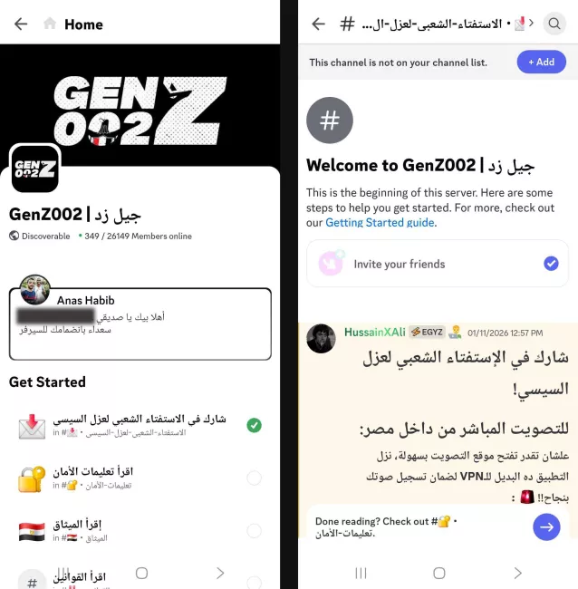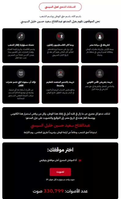 أطلق ناشطون على جروب باسم GenZ002 داخل تطبيق ديسكورد استفتاءً إلكترونيًا بعنوان "الاستفتاء الشعبي لعزل السيسي"، يدَّعي قياس رأي المصريين حول عزل الرئيس، تجاوز عدد المشاركين فيه 330 ألفًا. بالتزامن، انتشر على السوشيال ميديا هاشتاج #عزل_السيسي.